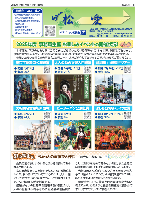 2025.10.27 TOPページ, お知らせ ◆会報「松愛」デジタル版 2025年11月号(第556号)を掲載しました 会報『松 愛』2025年11月号(第556号)のデジタル版を掲載しました。今号は ~2025年度 事務局主催 お楽しみイベントの開催状況!~ などを掲載しています。是非ご覧ください。 会報11月号「デジタル版」は 会員専用ページ へ TOPページ, お知らせ コメント: 0